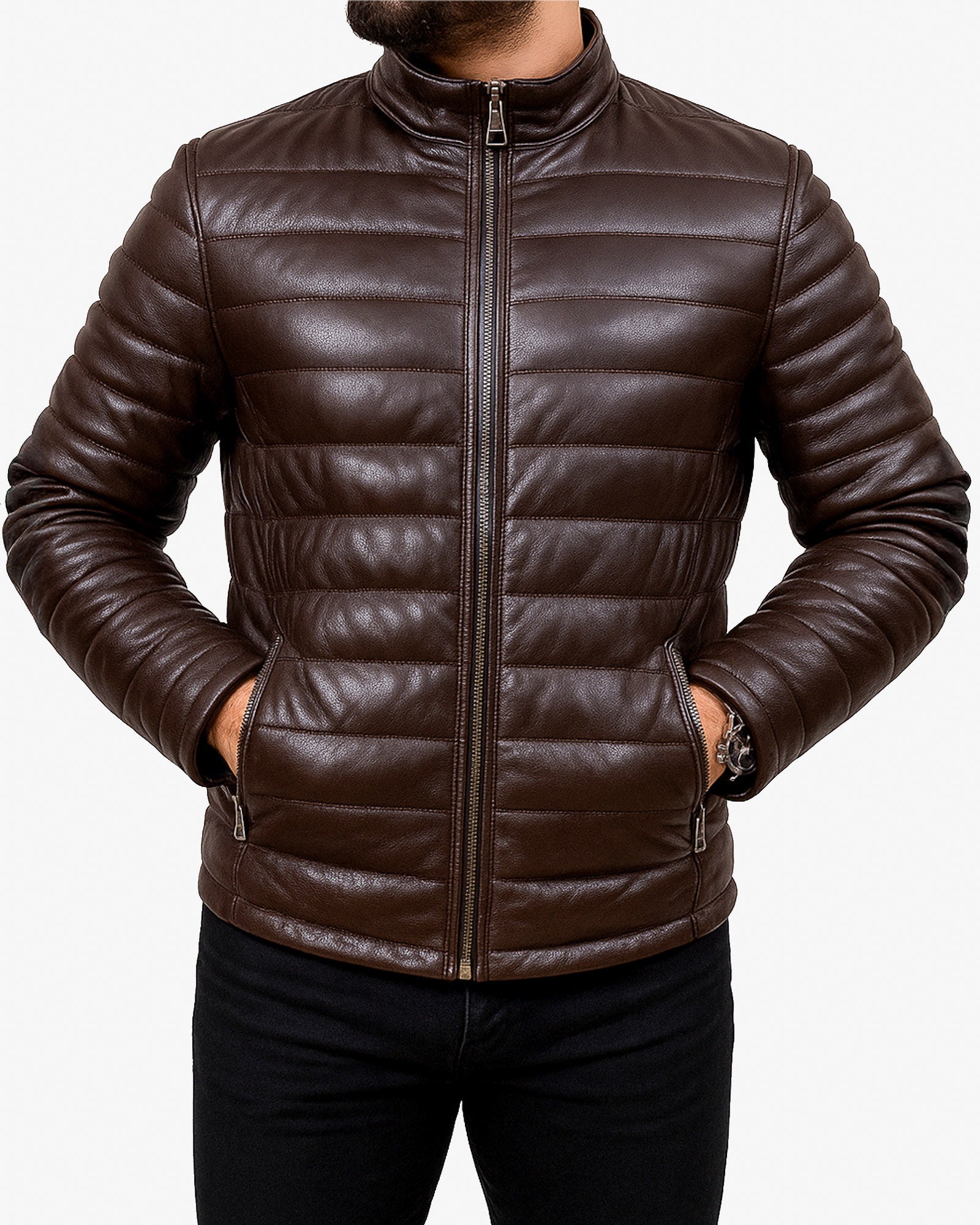 The “Brown Leather Puffer Jacket For Men” by LEATHER WEAR strikes the perfect balance between rugged and refined. Inspired by the timeless appeal of moto style, this jacket is crafted from 100% lamb leather, known for its buttery softness and lightweight feel. Designed to wear year-round, it’s your go-to piece whether you're dressing up or keeping it casual.