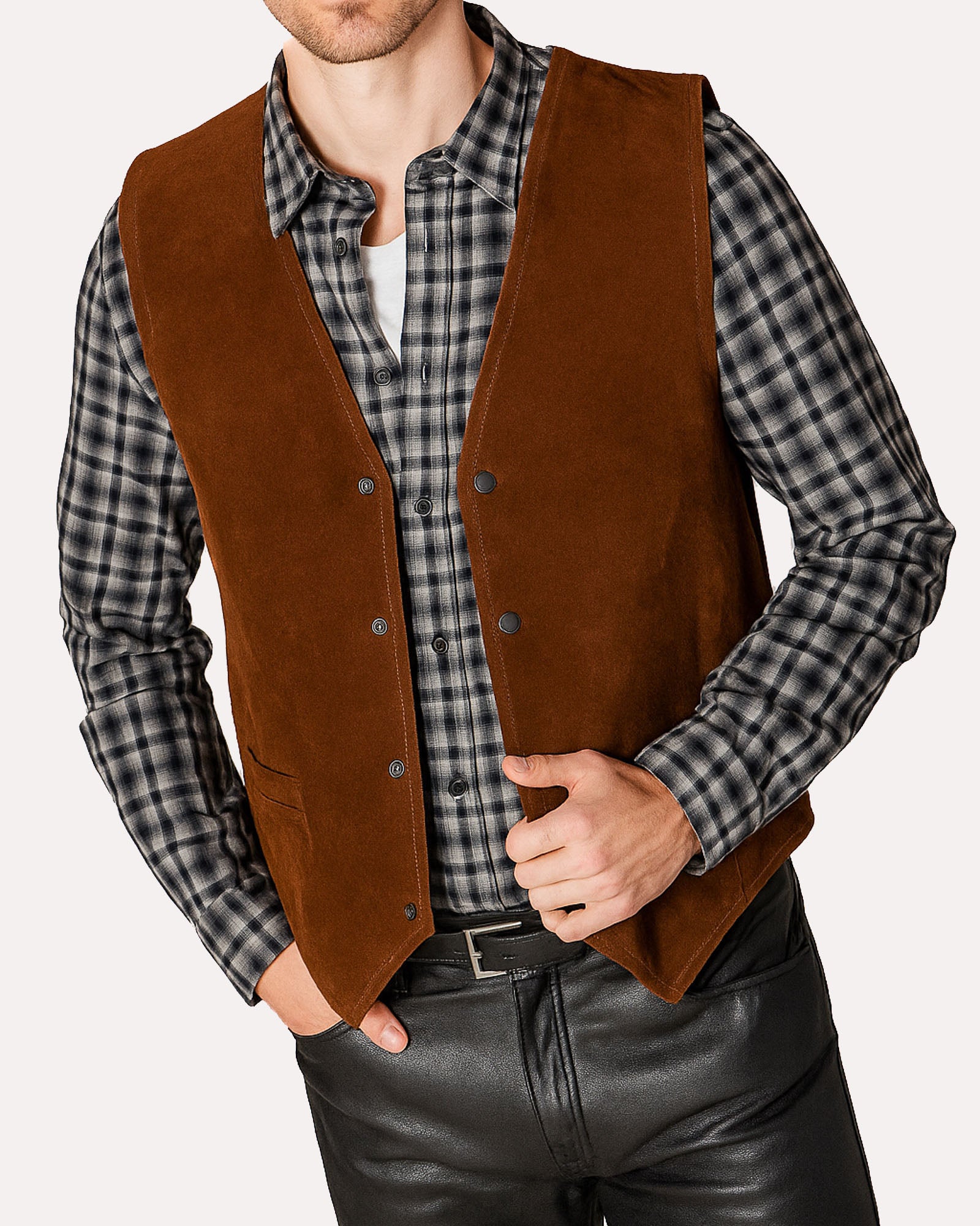 The “Brown Suede Leather Vest” by LEATHER WEAR strikes the perfect balance between rugged and refined. Inspired by the timeless appeal of moto style, this jacket is crafted from 100% lamb leather, known for its buttery softness and lightweight feel. Designed to wear year-round, it’s your go-to piece whether you're dressing up or keeping it casual.